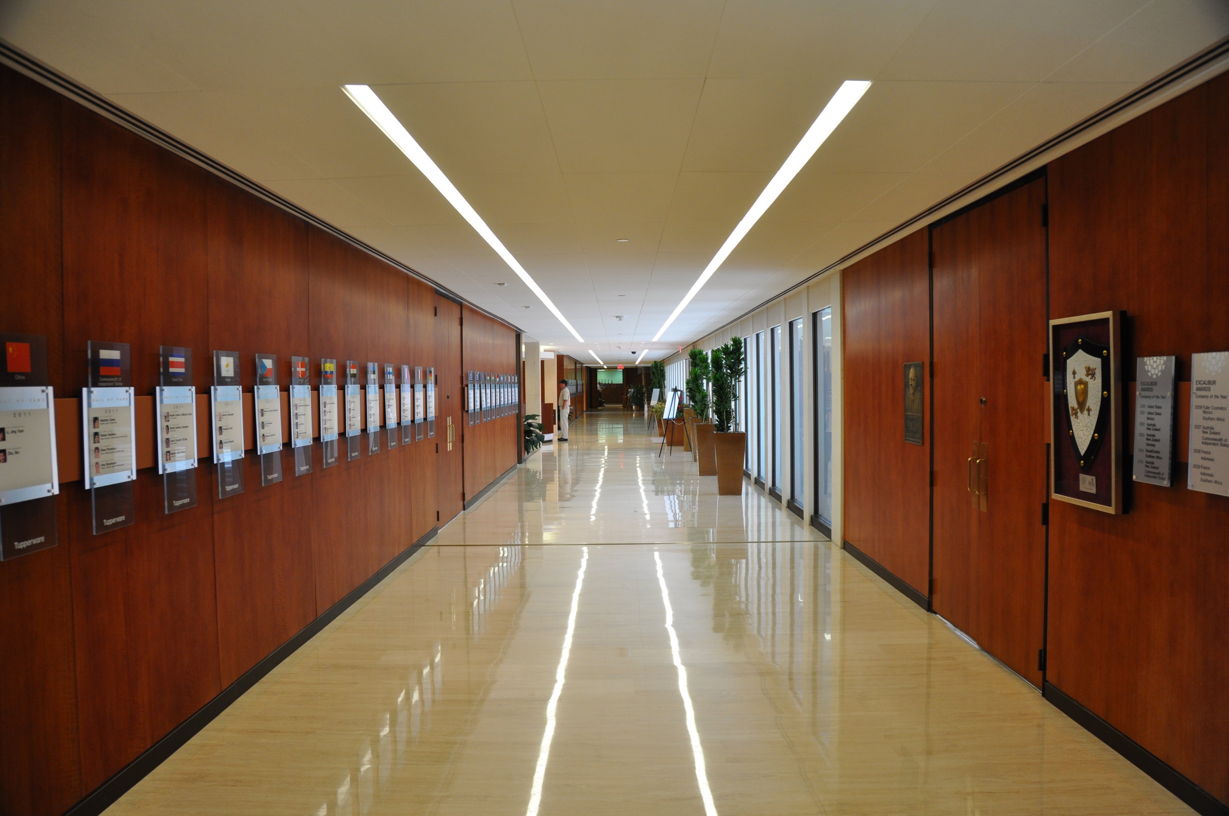 The company utilizes the entry arcade as a “Hall of Fame”, lining the walls with recognition areas that showcase the achievements of top Sales Force Members around the world. Restoring the rare Rhodesian Walnut wall panels and white travertine floors throughout the space maintained the integrity of the design and created a perfect backdrop for the Sales Force “Hall of Fame” displays. Aging and obsolete ceiling, lighting and mechanical systems were brought up to modern standards using monolithic ceiling tiles and linear lighting fixtures which accentuate the length and scale of the arcade.