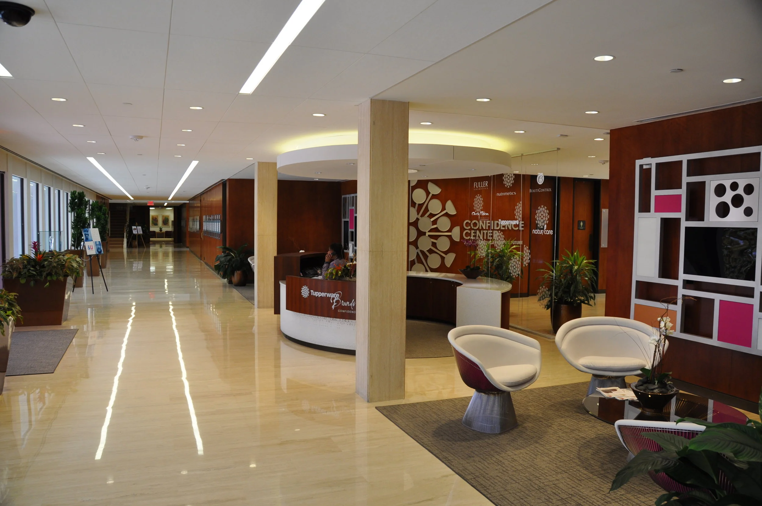 Visitors to the Tupperware Brands Headquarters building are greeted at the main reception desk situated in the center of a spacious arcade spanning nearly the entire width of the building. While the previous reception desk was dark and rectilinear, the new custom oval reception desk reflects the Company’s logo and offers an organic contrast to the building’s linear architecture. The desk features backlit white Sensitile panels accented with dark wood, mirroring the contrast of the opulent interior finishes of the entry arcade. Above the reception desk, a round floating ceiling features a custom logo-branded LED light fixture. Seating areas located on either side of the reception desk pay homage to Mid-Century design with custom-made, Mondrian-inspired branded wall art, and classic Platner chairs upholstered in Tupperware’s signature fushia color.