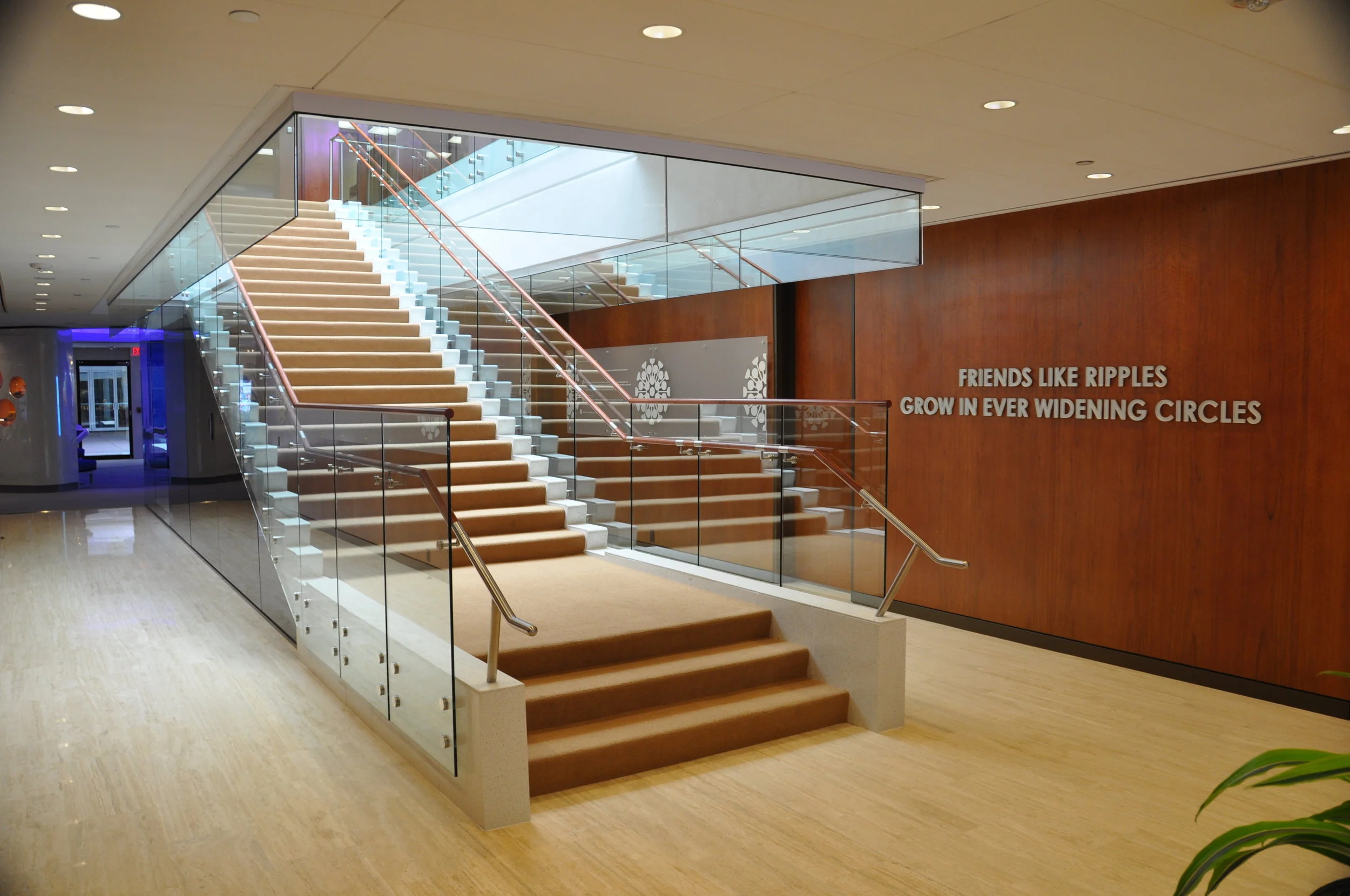 Located directly behind the main reception desk is the Grand Stair which leads up to the second floor C-Suites. The same design approach was taken here, replacing the original banister’s iron vertical posts with modern clear glass panels and creating an extended terrazzo-clad plynth at the base of the stair on which to mount the panels. The result remains true to Durell Stone’s original design intent while using modern construction materials and techniques.